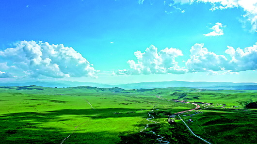 盛夏时节,位于青海海晏县境内的金银滩草原青山滴翠,碧野千里,宛如一幅壮美画卷(7月30日摄)。 新华社记者吴刚摄