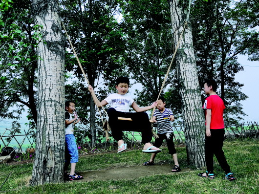 ▲学生放假后在孔家沟村新建的院落内玩耍(7月2日摄)。这个暑假,四年级学生李艺博没有像往常那样待在县城,而是带着同学一起回到了老家孔家沟村,“现在我们村在县里可出名了。”李艺博说。