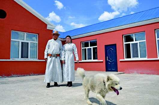 ▲牧民阿日斯楞和妻子特日格乐站在自家庭院中合影。 新华社记者贝赫摄 |