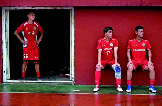 河南省实验中学高中足球队队员郭林枫(右)、曹森浩(中)在训练间隙休息(7月22日摄)。
