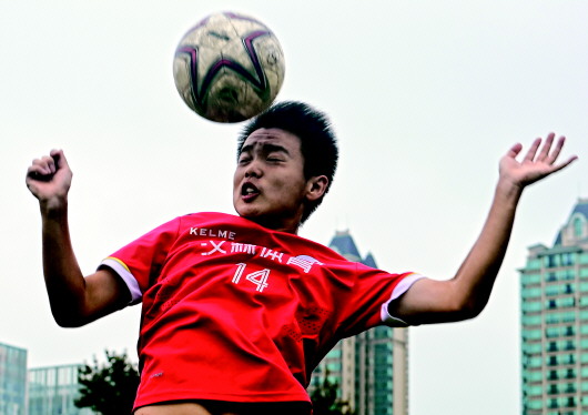 河南省实验中学高中足球队队员马铭辰在进行头球练习(7月22日摄)。 新华社记者李嘉南摄