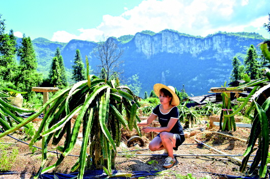 ▲8月3日,在湖南省保靖县碗米坡镇首八峒村,种植基地负责人易润菊在查看火龙果受损情况。