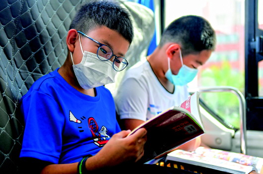 8月5日,小读者在“流动图书馆”里看书。 新华社记者许畅摄