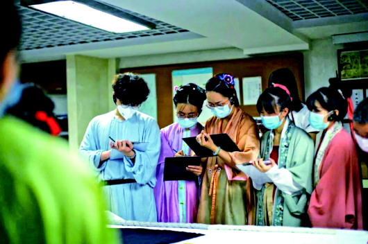 汉服商家、研究者们在中国丝绸博物馆仔细记录文物细节。 (陈润熙/摄) |