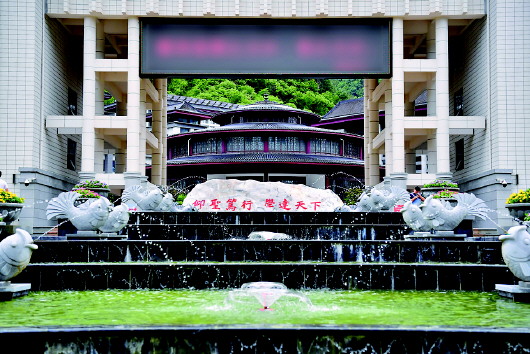 下图:镇安县镇安中学“鲤鱼跳龙门”水景、行政楼方形拱门与天坛祈年殿造型的图书馆(七月二十三日摄)。 新华社记者邵瑞摄