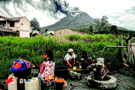 8月14日,人们在印尼北苏门答腊省正在喷发的锡纳朋火山附近洗衣服。锡纳朋火山位于印尼北苏门答腊省卡罗县,在沉寂近400年后于2010年首度喷发。2019年5月以来,该火山一直处于三级警戒级别。印尼境内现有129座活火山。新华社发(达马尼克摄)