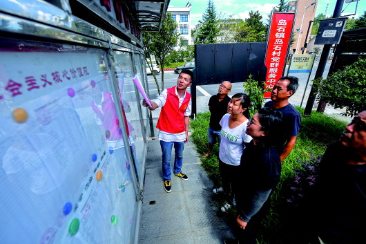 8月13日,在杭州市临安区岛石镇岛石村的村务公开栏,党员志愿者给村民讲解村务公开的各项具体内容。