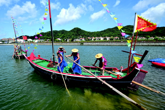▲蚂蚁岛居民为游客表演木帆船捕鱼(8月1日摄)。 新华社记者黄宗治摄 |