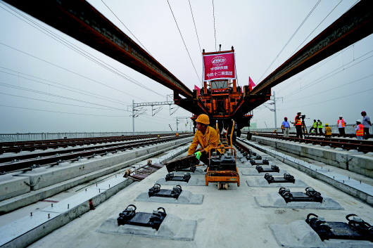 8月17日,中铁十二局的工人在安装最后一段钢轨。当日,京雄城际铁路全线轨道贯通。
