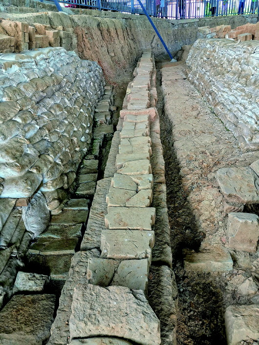 没走多远就看到一处被栅栏保护起来的遗址,陈卫东说这就是考古发现的宕渠城西城门,分为城内和城外两部分。城外发现了西城门和一条排水沟,这是目前发现的中国最早砖木结构城门。