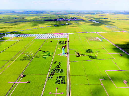 8月21日拍摄的黑龙江省富锦市万亩水稻公园中的稻田画。