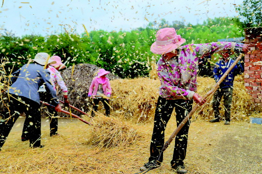 8月22日,元古堆村村民在脱麦子。目前,在甘肃省定西市渭源县元古堆村,村民正忙着脱麦子。当地种植的590多亩冬小麦近日喜获丰收。新华社记者马希平摄