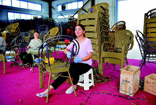 陕西汉阴县涧池镇紫云南郡社区居民在社区工厂内制作藤条椅(7月24日摄)。