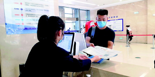 一位企业负责人在天津市滨海新区政务服务办全流程自动化制证中心领取排污许可证(8月11日摄)。
