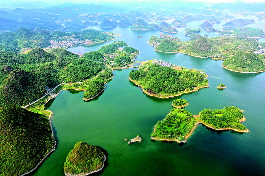 8月31日拍摄的百花湖风光(无人机照片)。秋日时节,贵阳市百花湖百余个岛屿峰峦起伏,呈现出一幅美丽画卷。 新华社记者刘续摄