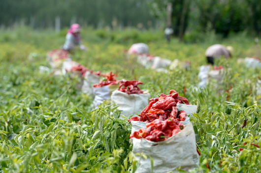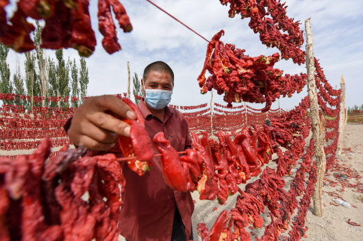 秋收时节,位于天山南麓的新疆巴音郭楞蒙古自治州50余万亩辣椒进入采摘期,农民抢抓晴好天气采摘、晾晒、烘干辣椒,田间地头一派繁忙景象。近年来,当地不断调整农业产业结构,通过鼓励农民订单种植优质高产辣椒品种,引导辣椒产业化发展,带动当地群众增收致富,巩固脱贫成果。 新华社记者丁磊摄