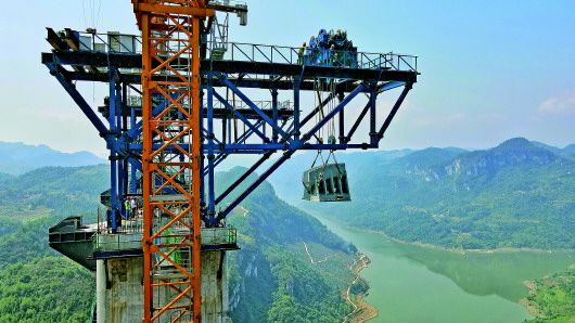 9月1日,贵州瓮开高速公路开州湖特大桥主塔主索鞍吊装成功,标志着大桥正式进入上部主体施工阶段。 新华社记者刘续摄