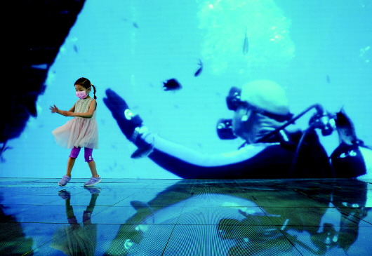 图.:9月5日,在服贸会旅游服务专题展区内的世界旅游城市联合会展台,一名儿童在播放着旅游宣传片的大屏幕前。 新华社记者才扬摄 |