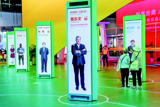图0:9月5日,参观者在服贸会综合展区与“人物柱”互动。本届服贸会综合展区序厅,环形摆放着24个“人物柱”,是此次综合展上的“行业故事讲述人”。 新华社记者彭子洋摄 |
