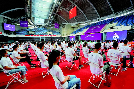 ▲9月9日,在清华大学综合体育馆,部分2020级本科生参加开学典礼。当日,清华大学举行2020级本科生开学典礼,开学典礼采用线上线下结合的方式举行,共设21个线下会场,并通过网络进行直播。 新华社记者鞠焕宗摄