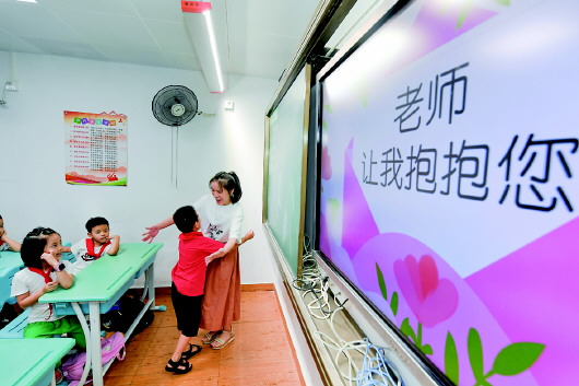 在福州市乌山小学,二年级学生在《老师,让我抱抱您》主题班会上拥抱老师,向老师表达感恩之心(9月9日摄)。 新华社记者宋为伟摄