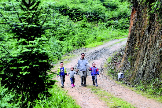 ▲在广西融水苗族自治县汪洞乡新合村,达佑教学点教师周宏军午饭后领着学生回学校上课(2019年5月28日摄)。 新华社记者陆波岸摄 |