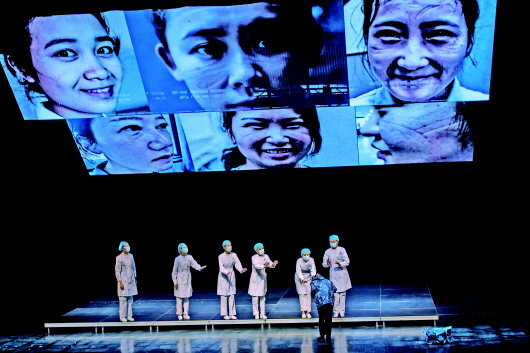 9月11日,抗疫题材话剧《逆行》在武汉中南剧场上演。武汉人民艺术剧院的演员们穿上防护服,换上白大褂,深情演绎抗疫一线医务人员的感人故事。新华社记者肖艺九摄 |
