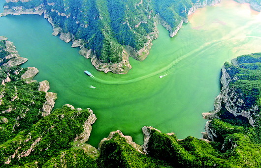 河南济源黄河三峡景区位于小浪底水利枢纽工程上游。初秋时节,山水交融,游船穿梭,犹如一幅画卷(9月12日摄)。 新华社记者郝源摄