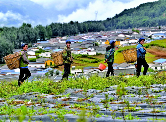 四川省凉山彝族自治州布拖县拖觉镇老吉村的妇女在去往蓝莓种植基地务工的路上(8月13日摄)。