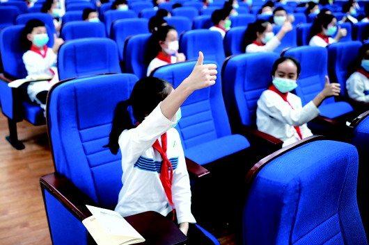 北京朝阳区实验小学贵阳分校的学生,为前来讲课的抗疫医生点赞(五月二十五日摄)。