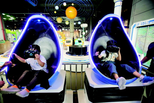 9月19日,小朋友在南京科技馆通过VR技术体验“海底两万里”。