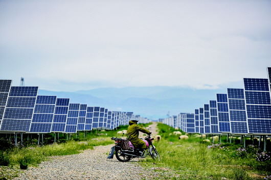 登上47米高的瞭望塔,曾经的荒漠戈壁变了模样,高天流云的影子在绵延天际的太阳能电池板上移动。