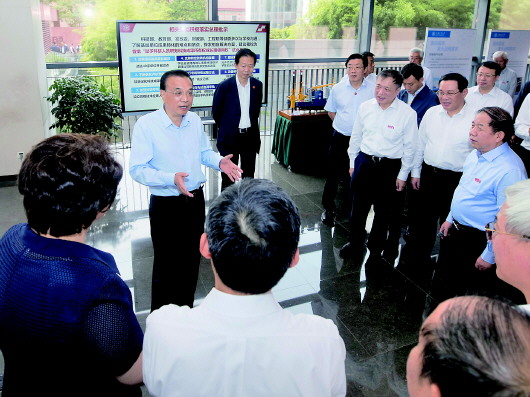 在上海交通大学,李克强走进海洋工程国家重点实验室,考察基础研究和科技创新。他来到钱学森图书馆观看学校科研成果展示,与院士、教授们就破除制约科技创新活力的障碍深入交流。他说,深化科技体制改革要加强制度创新,解决科技人员反映的“破而不立”、“政策空窗期”等问题,把科研人员的创造性更好激发出来,加快有创新力的科研成果产业化商业化,转化为现实生产力。他勉励大学生们传承创新精神,将来用自己的创造贡献国家和社会。