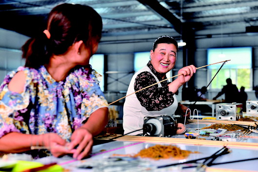 9月22日,在鄄城县潍柴动力董口镇黄河社区致富车间,刘月娥(右)与工友交流。