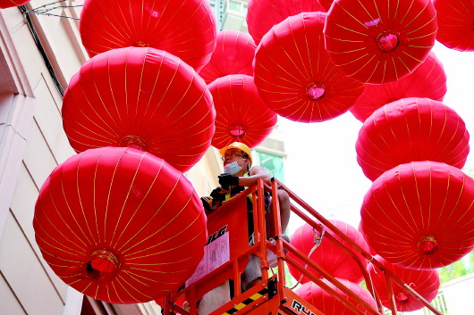 为迎接这稀罕的双节,湾仔的利东街早已“打扮”起来。工人们顶着烈日将一个个红红火火喜气洋洋的大红灯笼,高高地悬挂在这条约200米长的步行街上空。