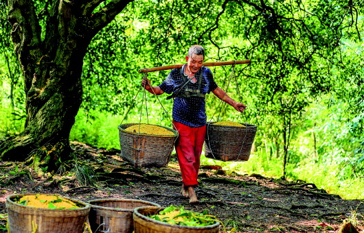 图④:天堂村的村民在收捡散落在房顶上的桂花。