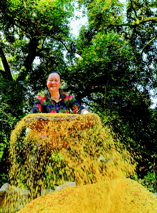 图①:9月24日,四川省泸州市江阳区邻玉街道天堂村的村民在打收桂花。