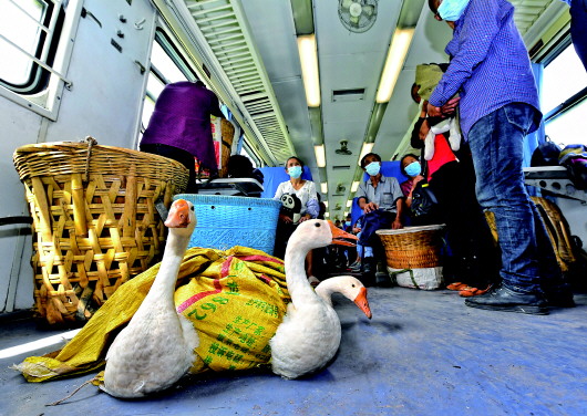 为了方便群众,车厢里专门做了改造——每节车厢的两头拆除了两排座位,用于堆放行李和货物,还有一节专门运牲畜和大件行李的车厢。每逢彝族新年,列车里猪、牛、羊的声音此起彼伏。不少老乡的背篓里还放着花椒、土豆、折耳根等蔬菜和各类草药、山果。车厢里,由乘客们肩挑手提的货物普通又繁杂,却是山里人家的生活来源,外出务工的老乡们也由“小慢车”开始踏出离家的第一步,列车虽小且慢却承载着沿途百姓走出贫困的希望。