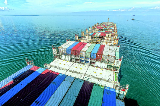 ▲这是9月23日拍摄的一艘行驶在海南洋浦小铲滩码头海域的中远海运集装箱货轮。