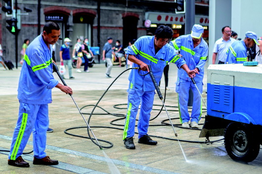▲9月10日,在上海南京路步行街东拓段开街前夕,环卫工人正在用水枪清洗东拓段路面。