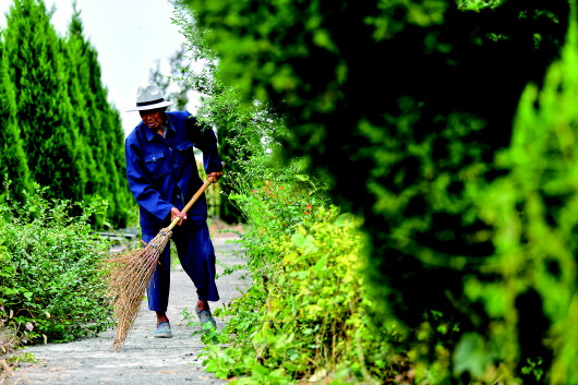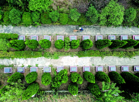 胡兆伦在清扫烈士陵园。新华社记者刘军喜摄
