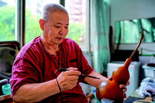 71岁的刘振居住在江西省南昌市青山湖区塘山镇高新社区,因为常年使用葫芦进行创作,他被人们亲切地称为“葫芦爷爷”。