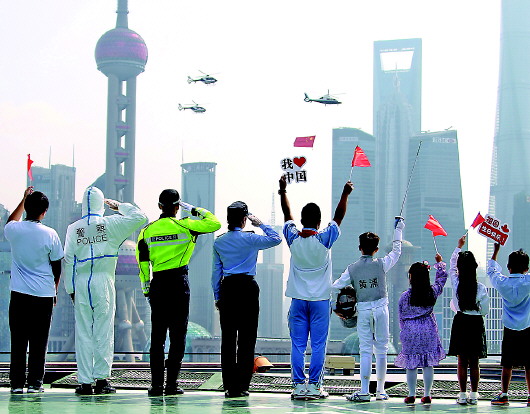 10月1日,上海市公安局警务航空队的警用直升机悬挂国旗在黄浦江上空编队飞行,庆祝中华人民共和国成立71周年。 新华社记者陈飞摄