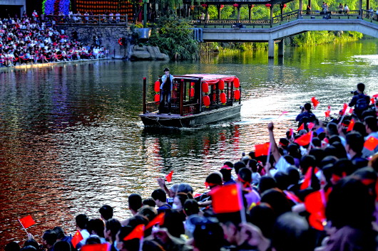 10月1日,在杭州宋城景区,歌手带领游客合唱歌曲《我和我的祖国》。