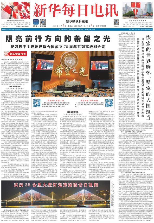 非常时期的联合国会议,注定将在历史上镌刻下鲜明的中国印记。和平发展、合作共赢的思想光芒,定能穿透战争、灾害、贫穷、落后的阴霾,指引人类迈向更加光辉灿烂的未来。新华社北京10月2日电