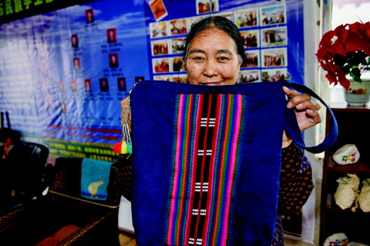 长江源村岗巴布民族手工艺品专业合作社的社员展示制作的工艺品(摄于2020年5月)。