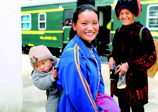 5633次列车抵达月华站,旅客背着孩子出站(9月28日摄)。 均为新华社发(李锴摄) |