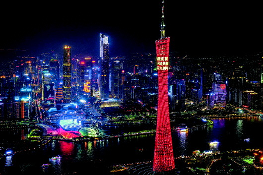 广州塔点亮节庆彩灯,城市中轴线流光溢彩。今年国庆假期,乡村游、历史文化游、夜间游等旅游方式受到广大游客欢迎。 新华社记者刘大伟摄