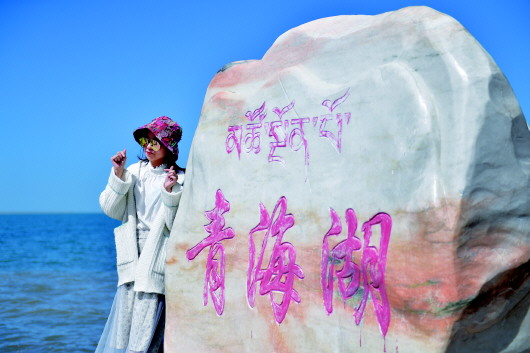 9月23日,游客在青海湖边拍照留念。 新华社记者张龙摄