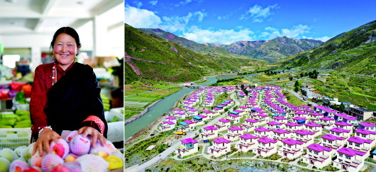 拼版照片:左图为西藏自治区昌都市丁青县尺牍镇巴登村村民强珍在尺牍镇农贸市场自己的摊位前(9月18日摄);右图为尺牍镇易地扶贫搬迁安置点一角(9月18日摄)。